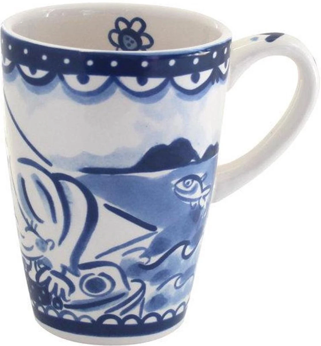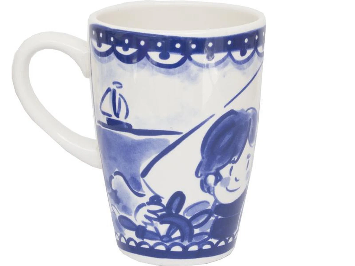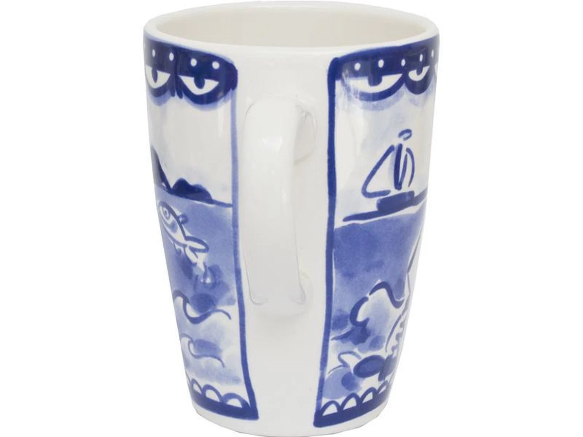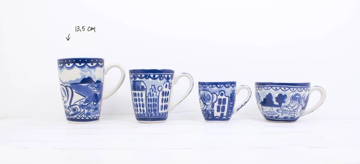 Deze beker XL van Blond Amsterdam komt uit de collectie Delfts Blond. Deze vrolijke beker is 13,5cm hoog, heeft een doorsnee van 9,5 cm en maar liefst een inhoud van 0,5 liter. De beker is van aardewerk en magnetron- en vaatwasmachinebestendig.