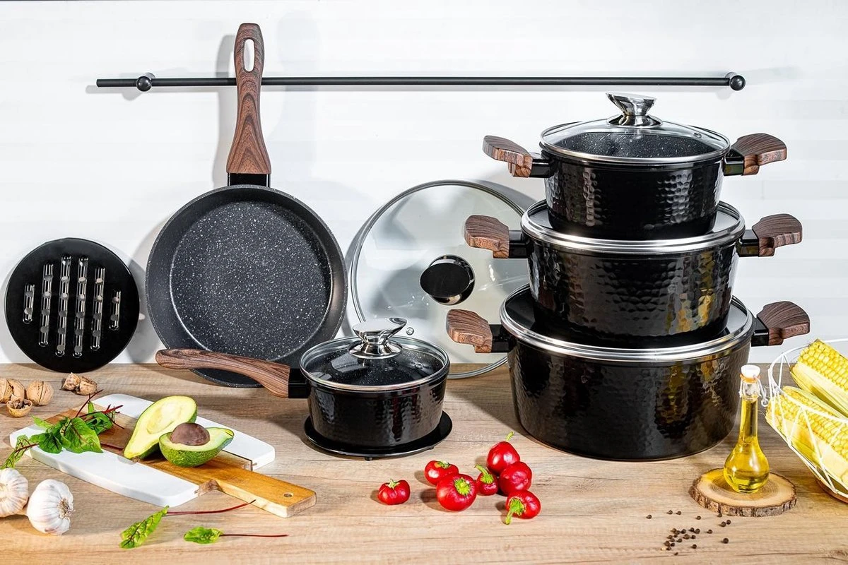 Deze prachtige pannenset van Edënbërg wordt geproduceerd onder de strengste Duitse normen en met het beste aluminium. De bodem is bedekt met maar liefst 3 lagen marmer met een mooie zwarte binnenkant die niet verkleurd. Dankzij de dikke bodem zijn de pannen zeer duurzaam en wordt het eten gelijkmatig verwarmd.