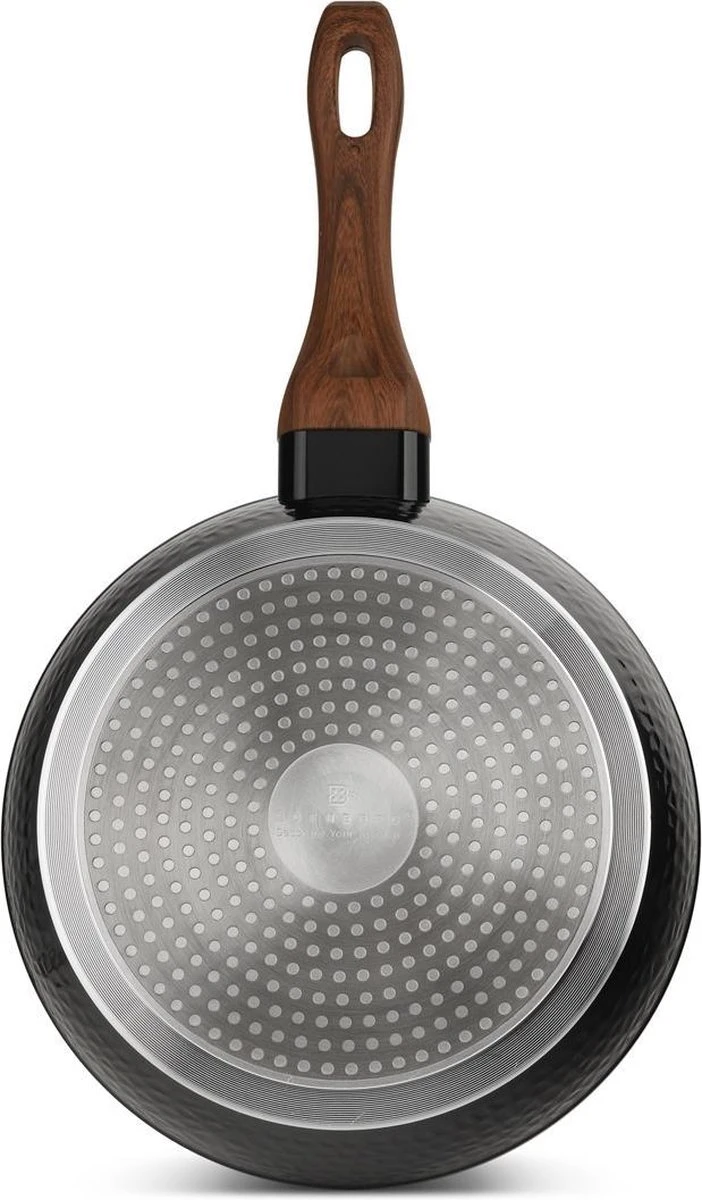 - Gegoten aluminium, met keramische/marmeren coating, ideaal tegen aanbraden, en vetarm koken