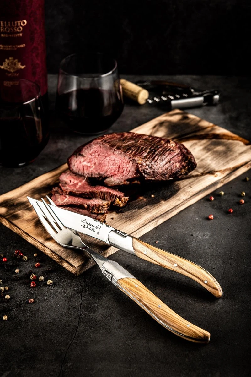 De Laguiole Style de Vie Luxury Line vorken met olijfhout worden aangeboden in een set van 6 stuks. De vorken hebben een dikte van 2,5mm en worden gemaakt van hoogwaardig RVS en olijfhout. De rug van het handvat is mooi versierd en is te herkennen aan het bijtje. De vorken uit de Luxury Line hebben een totale lengte van 22cm. De Laguiole steakvorken worden geleverd in een mooi zwart houten kistje met de afmetingen 24,5x13x4,5cm (lxbxh). De vorken zijn niet vaatwasmachinebestendig.