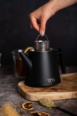 VDN RVS Theepot Dubbelwandig Met Filter – Zwarte Theekan 1 Liter – 902