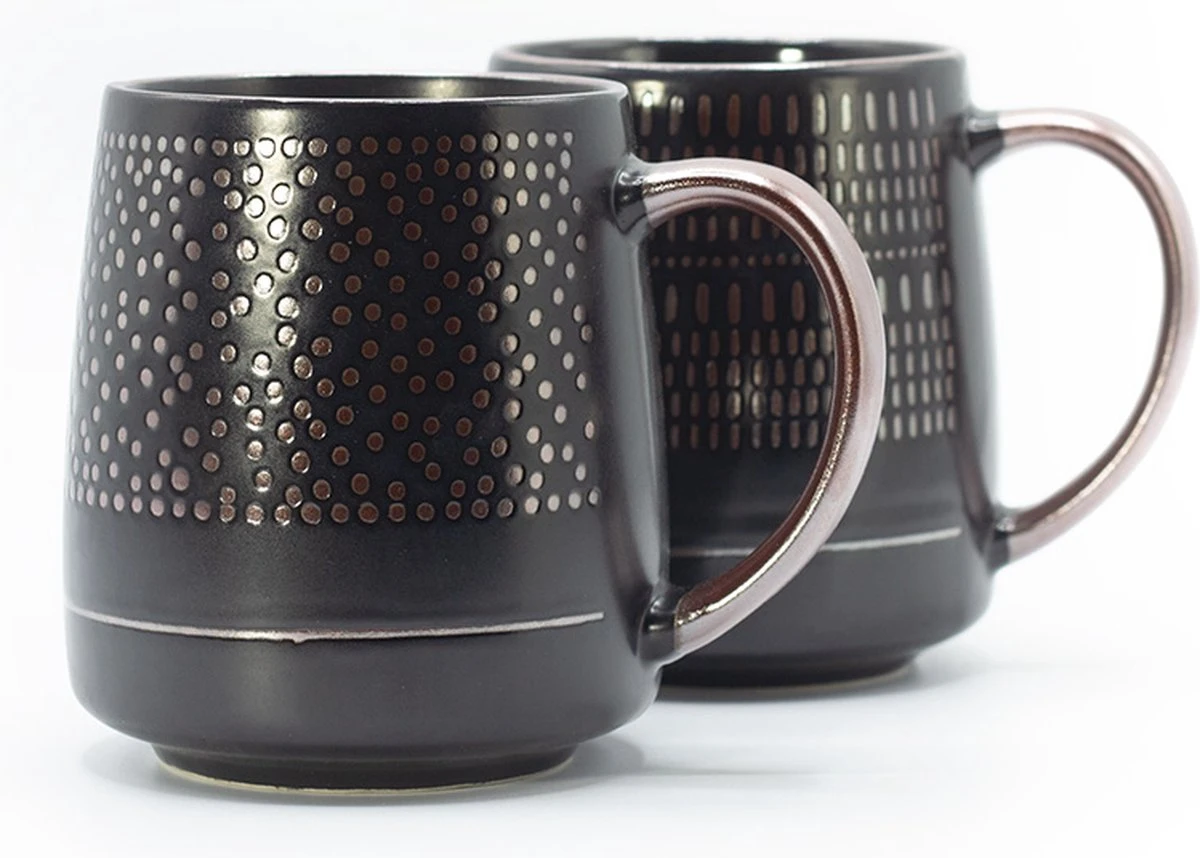 Trendy en stijlvolle mok in zwart met brons, gemaakt van keramiek.
